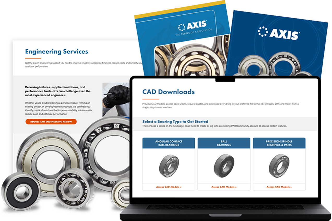 Axis does more than manufacture high-performance bearings. Whether you’re developing new products or troubleshooting recurring failures, we work with you to find innovative solutions that enhance performance and reliability. With decades of engineering expertise built into these resources, it’s never been easier to put our knowledge to work for you.