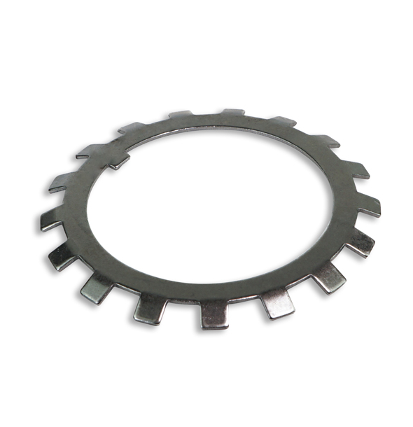 Lock washers prevent locknuts from loosening during operation by mechanically securing the nut in position. Used with shaft locknuts, they preserve the axial position established by the locknut in rotating assemblies exposed to vibration or shock loading.